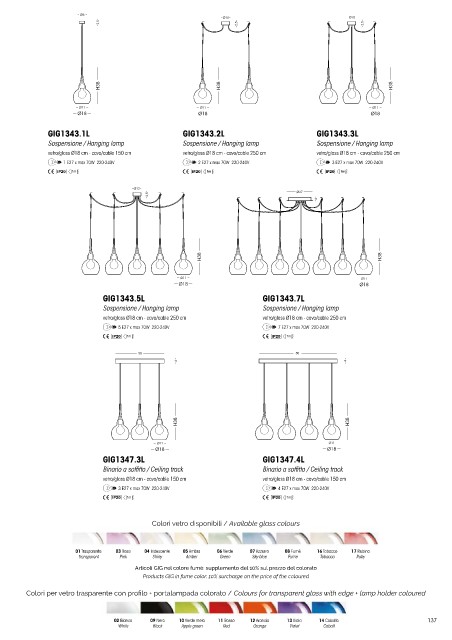 3 E27 x max 70W 220-240V 4 E27 x max 70W 220-240V Colori per vetro trasparente con profilo + portalampada colorato / Colours for transparent glass with edge + lamp holder coloured