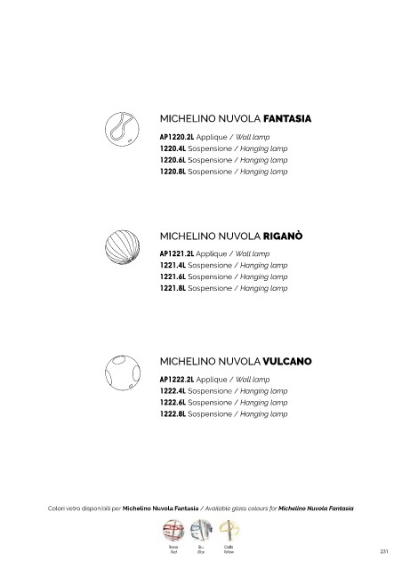 Colori vetro disponibili per Michelino Nuvola Riganò e Vulcano / Available glass colours for Michelino Nuvola Riganò and Vulcano