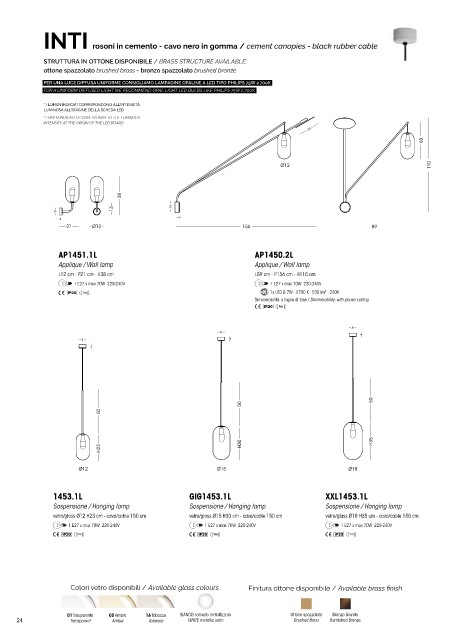 Colori vetro disponibili / Available glass colours Finitura ottone disponibile / Available brass finish