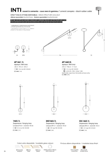 Colori vetro disponibili / Available glass colours Finitura ottone disponibile / Available brass finish