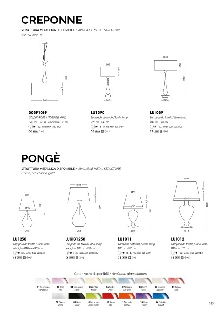 Colori vetro disponibili / Available glass colours Colori vetro disponibili / Available glass colours