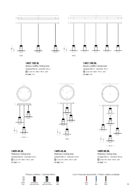 Colori vetro disponibili / Available glass colours Finitura cilindro / Cylinder finish Cavi in tessuto disponibili / Fabric cables available