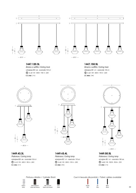 Colori vetro disponibili / Available glass colours Finitura cilindro / Cylinder finish Cavi in tessuto disponibili / Fabric cables available